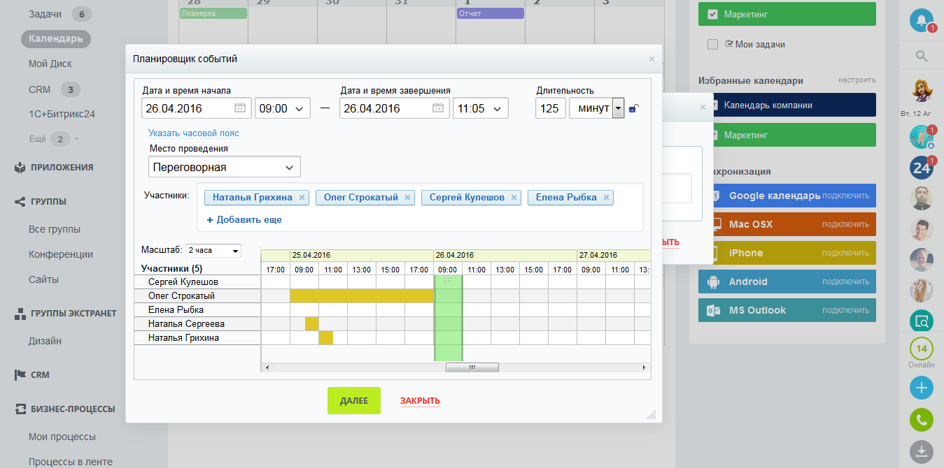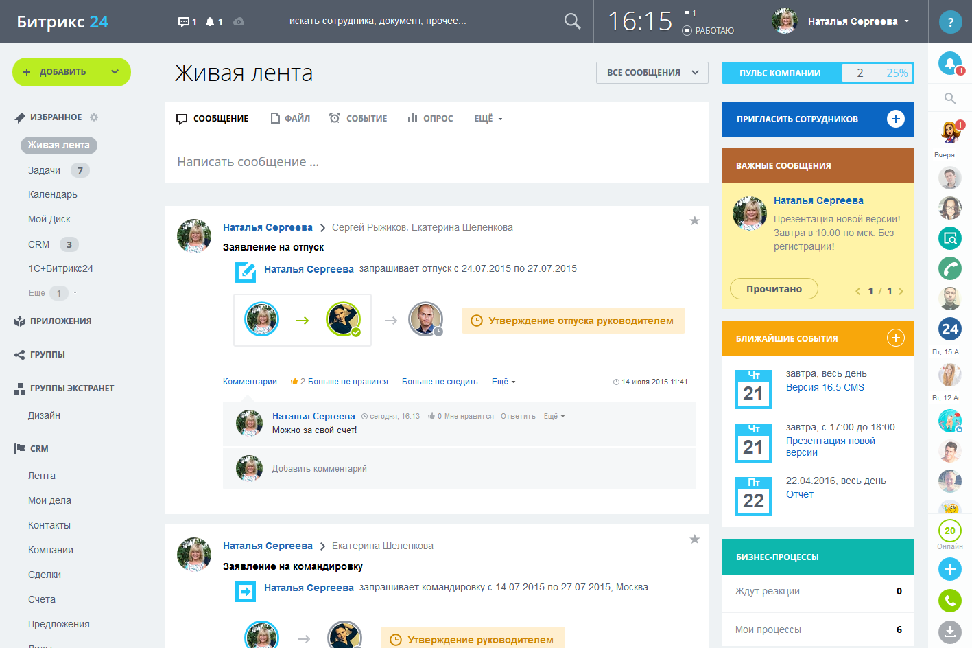 Облачный сервис для большой компании, позволяющий автоматизировать внутренние бизнес-процессы, например, документооборот. Тариф включает систему учета рабочего времени, формирующей отчеты по рабочему времени для каждого сотрудника и учитывающей затраты времени на выполнение задач. Вы можете автоматизировать свои собрания и планерки: рассылать автоматом приглашения, ставить в встречи в календари сотрудников, назначать задачи и отмечать выполненные в протоколе.Возможности